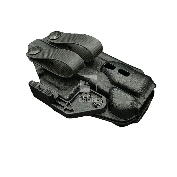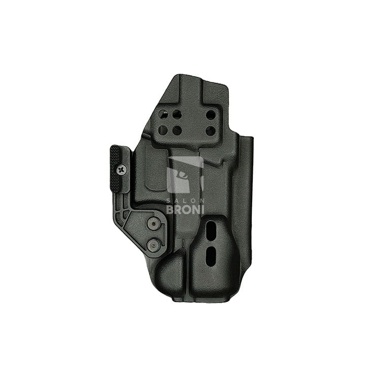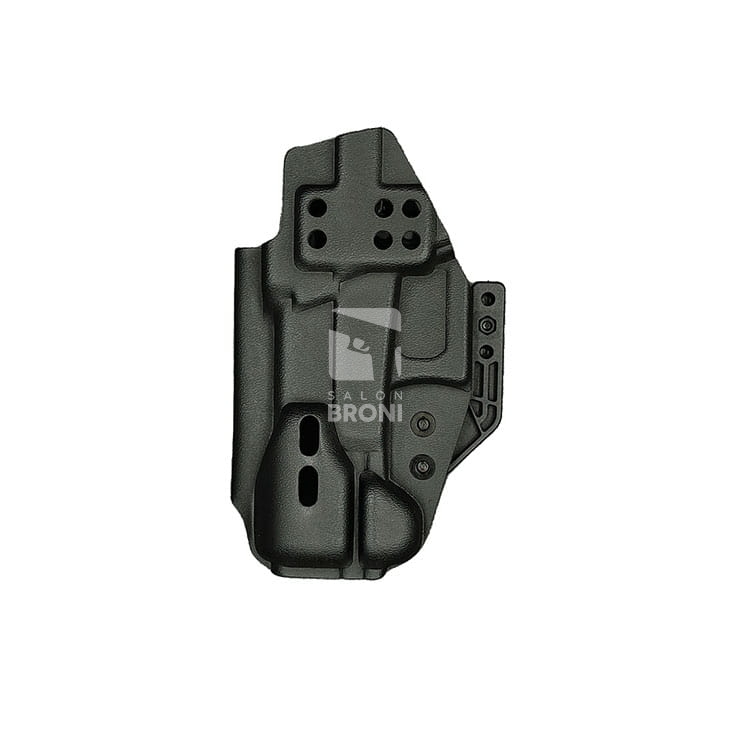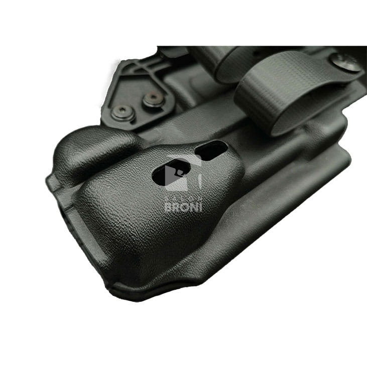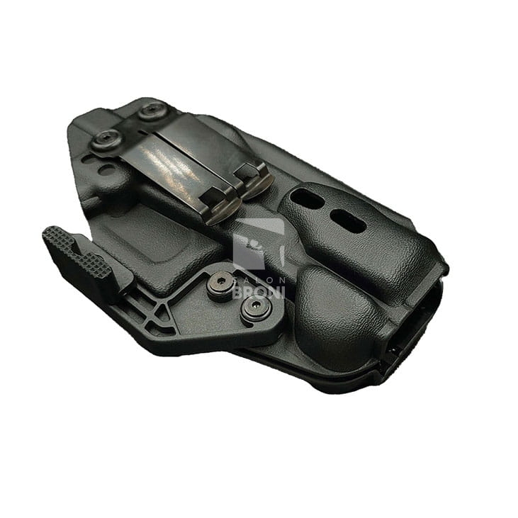 - Unikalny wystający kontur o kształcie zbliżonym do kropli w dolnej części kabury, który gwarantuje maksymalne dopasowanie do Twojego ciała, trzyma lufę z dala od niego i zapewnia maksymalne przyleganie rękojeści do ciała minimalizując printing broni