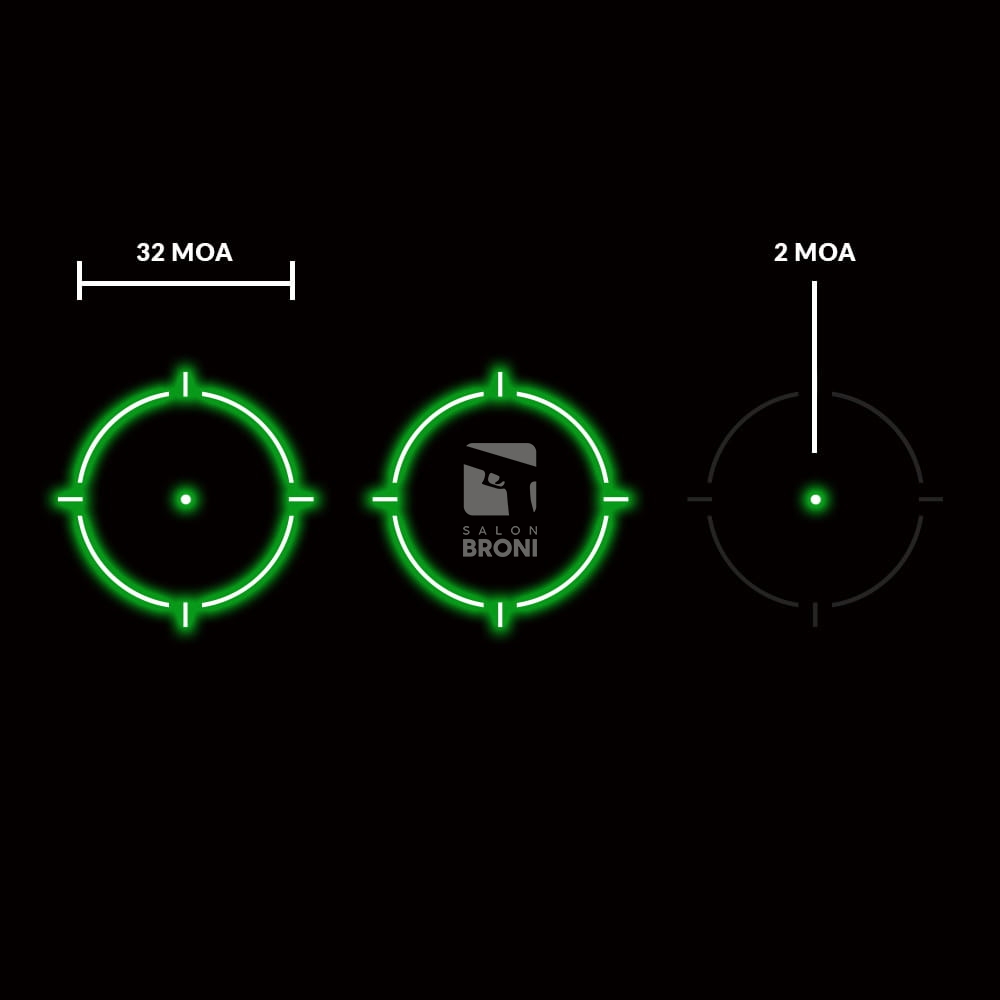 | Rozmiar punktu celowniczego | Kropka 2 MOA Okrąg 32 MOA |