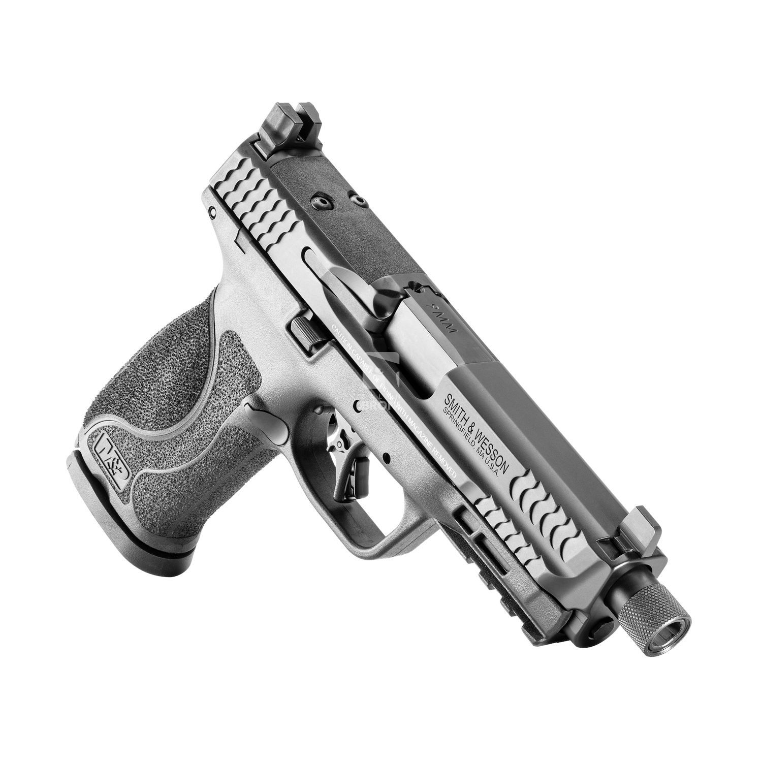 Pistolet wyprodukowany przez Smith & Wesson, największe w Stanach Zjednoczonych i jedno z największych na świecie przedsiębiorstw produkujących broń palną od 1852 roku. Modele M&P (Military & Police) nawiązują do uznanych rewolwerów S&W Military & Police kalibru .38 Special z 1899 roku. Zamek i lufę pistoletu wykonano z stali nierdzewnej, dodatkowo pokrywając ochronną powłoką Armornite® - powłoka antykorozyjna i zabezpieczenie przed refleksami światła. Szkielet wykonany jest z wysokiej jakości polimeru z możliwością zmiany profilu chwytu dzięki wymiennym nakładkom o różnych rozmiarach. Dodatkowo została zastosowana ulepszona tekstura chwytu pozwalająca strzelcowi lepsze kontrolowanie broni podczas strzału. Jest to wersja Optics Ready, więc ma podcięcie pod kolimator oraz siedem płytek montażowych. Ten model dodatkowo wyposażony jest w gwint na końcu lufy (.500 x 28 UNEF-2A RH) do montażu urządzeń wylotowych typu kompensator czy tłumik oraz podwyższone przyrządy celownicze (metalowe).