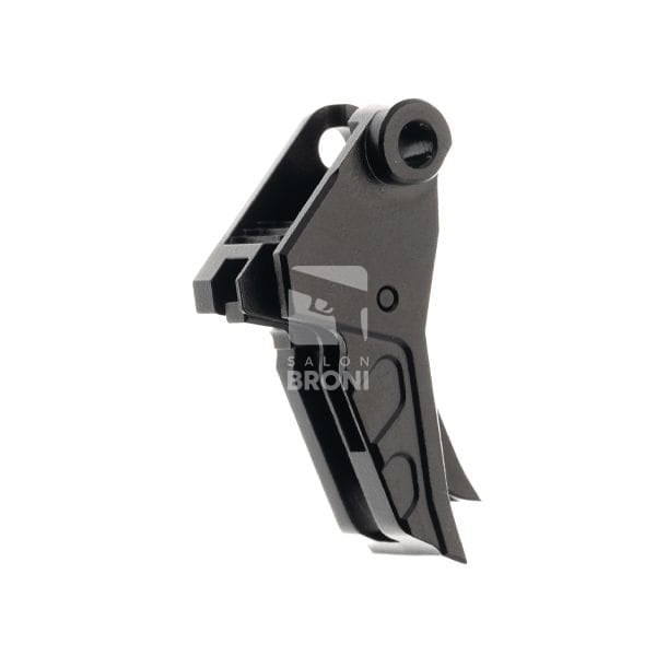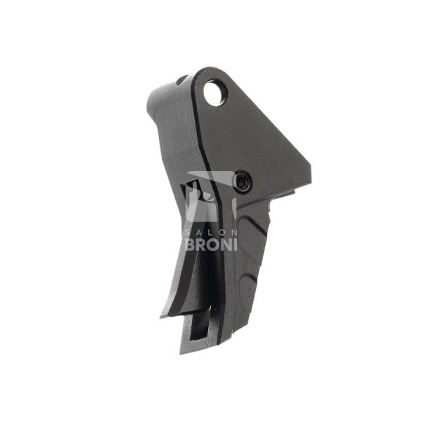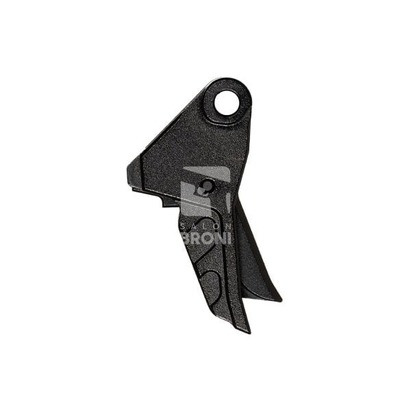 Geometria języka spustowego: hybrydowa, łącząca cechy płaskiego spustu (flat face) z delikatnie zaokrąglonym dolnym profilem (curved lip), co poprawia kontrolę nacisku i ergonomię chwytu.