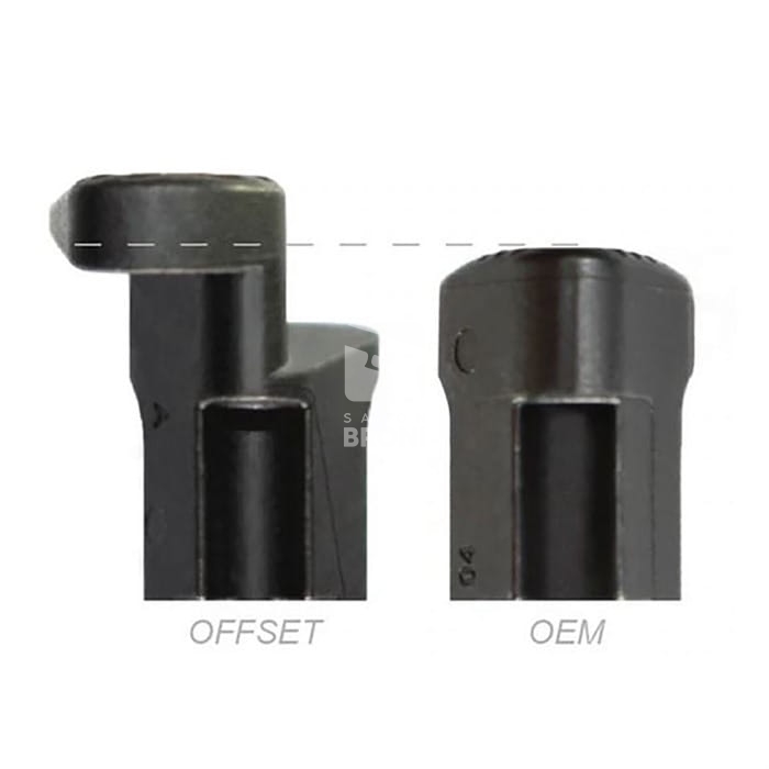 Powiększona powierzchnia przycisku wystaje 2 mm szerzej i została umieszczona wyżej, na szkielecie chwytu, zapewniając tym samym skuteczne działanie, przy jednoczesnym ograniczeniu ruchu kciuka.